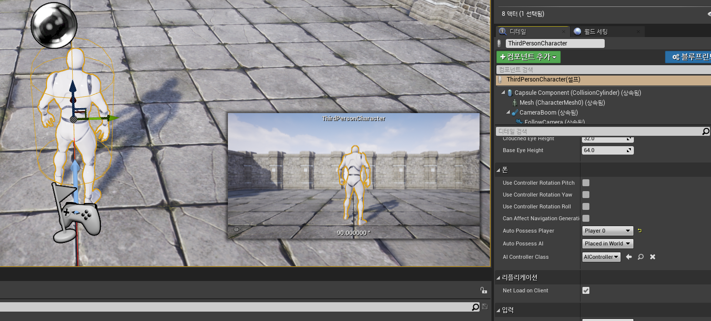 ThirdPersonCharacter을 레벨에 배치하고 Auto Possess Player 항목을 Player 0로 설정하면 ABPawn을 생성하지 않고 배치된 캐릭터에 빙의 된다.