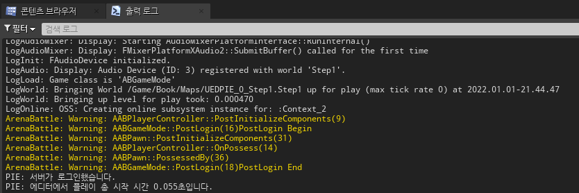 ABPlayerController 클래스를 직접 생성하여 과정을 확인해보자. 책에 있는 예제 코드를 따라하였고 한가지 달라진 점은 ABController의 Possess 함수는 4.22 버전부터 OnPossess 함수로 이름이 변경되었다. 코드 작성이후 실행하면 로그를 통해 호출 순서를 확인할 수 있다.