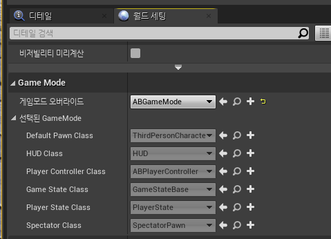 - Step2 레벨에서 월드세팅에 GameMode Override 항목을 생성한 ABGameMode로 선택