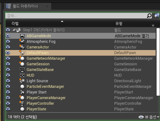 - 플레이 버튼을 눌러보면 월드 아웃라이너에 ABGameMode와 DefaultPawn이 생성됨을 확인