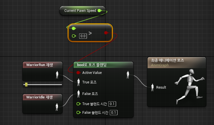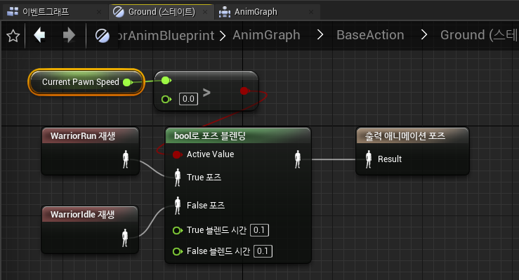 이후 이전에 생성해놓은 WarriorAnimBlueprint 애셋에서 부모 클래스를 ABAnimInstance로 변경하고 CurrentParnSpeed 변수를 가져와 0초과 일때는 Run 애니메이션을 0이하 일때는 Idle 애니메이션을 재생하도록 bool로 포즈 블렌딩 노드를 활용해 최종 포즈가 선택될 수 있도록 하였다.