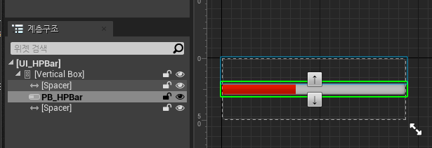 이번에는 캐릭터의 HP가 시각적으로 보이도록 UI위젯을 제작해보자. UI폴더를 추가하고 해당 폴더에 UI_HPBar이름을 가진 위젯 블루프린트를 생성하였다. 그리고 책을따라 다음과 같이 UI를 디자인 하였다.