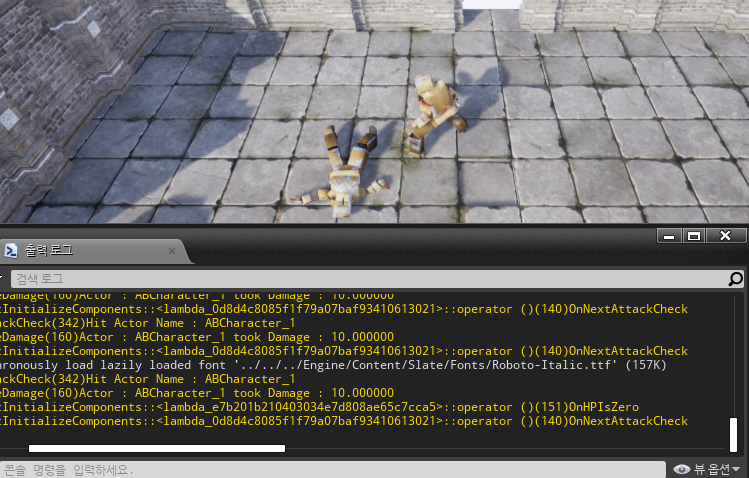 컴파일후 공격을 해보면 공격마다 대미지 10씩 주고, 체력이 다되면 사망모션이 출력되는것을 확인 할 수 있다.