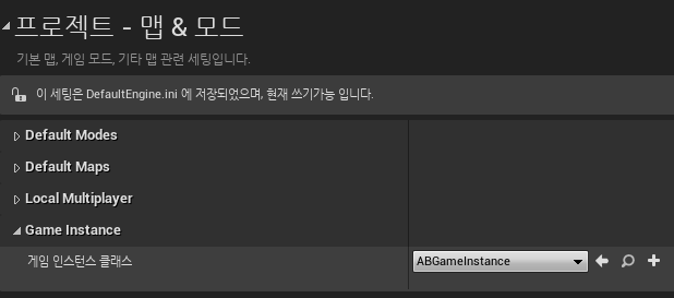 엑셀에 저장돼 있는 캐릭터 스탯 데이터 테이블을 언리얼 엔진에 불러들이는 기능을 구현해보자. 언리얼 엔진은 게입을 관리하기 위한 용도로 게임 인스턴스라는 언리얼 오브젝트를 제공한다. 이 게임 인스턴스가 게임의 데이터를 관리하도록 작업하고자 한다. GameInstance 클래스를 상속받는 ABGameInstance클래스를 생성하고. 생성한 ABGameInstance클래스가 게임을 관리하도록 지정하기 위해 프로젝트 세팅의 맵&모드 탭에서 GameInstance 항목을 ABGameInstance로 지정하였다.