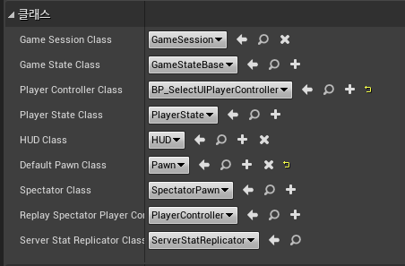 이어서 예제파일중 UI_Select.uasset파일을 복사하였고, Select.umap 레벨 파일도 복사하였다. 타이틀과 동일한 방법으로 ABUIPlayerController를 상속받은 BP_SelectUIPlayerController 블루프린트를 생성하였고, UIWidgetClass를 UI_Select로 지정하였다. 또한 BP_SelectGameMode라는 게임모드를 생성하여 설정하였다. 마지막으로 Select 맵의 월드세팅을 BP_SelectGameMode를 기본으로 지정해주었다.