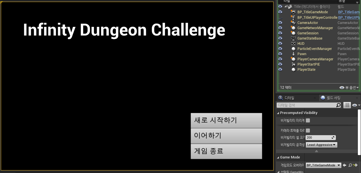 월드세팅의 게임모드를 BP_TitleGameMode로 설정하여 플레이를 해보면 타이틀 UI가 화면에 뜨는것을 확인할 수 있다.