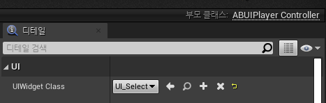 그리고 콘텐츠 브라우저에서 블루프린트 클래스 메뉴를 선택하여 ABUIPlayerController 를 상속받는 BP_TitleUIPlayerController 이름의 블루프린트 애셋을 생성한다. 생성한 애셋의 UIWidgetClass를 UITitle로 설정을 하였다.