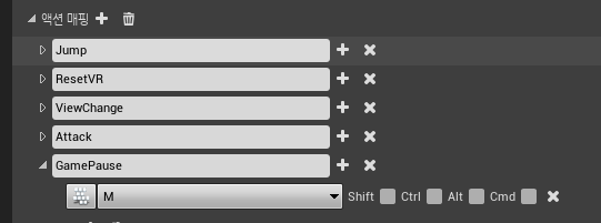 예제 파일 폴더에서 UI_Menu.uasset 파일과 UI_Result.uasset 파일을 복사하였다. 그리고 GamePause라는 액션 매핑을 M 키로 추가하였다.