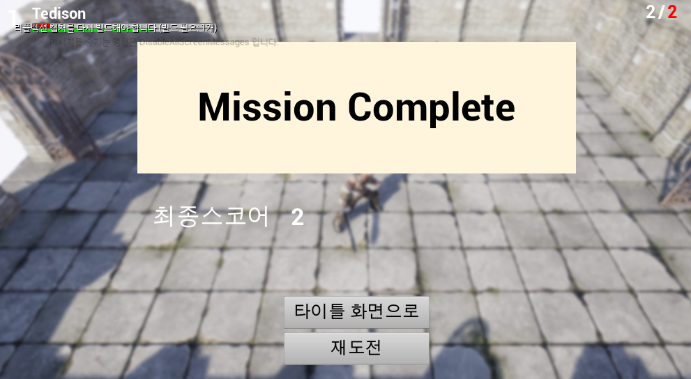 이후 책의 예제코드를 따라 나머지 코드를 작성하였다. 작성한 코드를 정리하기엔 양이 많아서 Github에 올려두는것으로 대체하고자 한다. 그리고 플레이어가 죽거나 클리어조건을 만족하면 결과 UI가 뜨는것을 확인하였다.