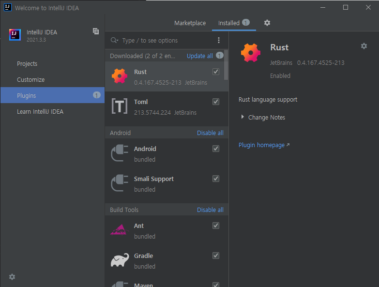 IDE 재시작이후 rust와 toml 플러그인이 설치되어있음을 확인할 수 있다.