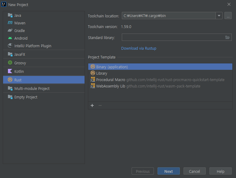 프로젝트를 새로 생성하기 위해 NewProject를 눌러 Rust탭을 선택하여 Next버튼을 눌렀다.