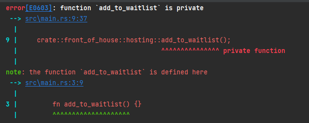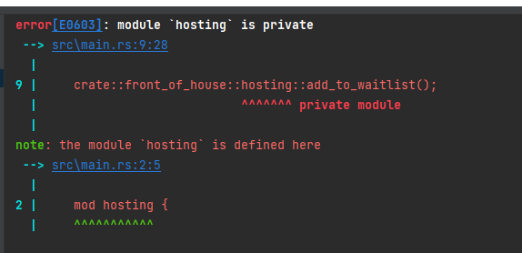hosting 모듈을 pub 키워드를 추가하여 공개 모듈로 변경하였지만. 아직 에러메시지가 출력된다. hosting 모듈만 공개된다고 아이템들이 전부 공개되는건 아니기 때문이다. 그래서 함수에도 pub 키워드를 추가하여 함수를 공개처리하여 컴파일 되도록 수정하였다.