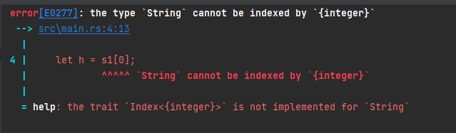 다른 언어에서는 문자열의 개별 문자를 인덱스를 이용해 접근할수 있지만 러스트에서는 에러가 발생한다.