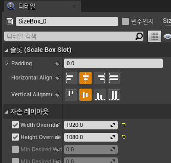 Size Box의 Width와 Height Override를 입력해서 원하는 사이즈를 가지도록 설정하고 Scale Box의 슬롯의 정렬을 가운데 정렬로 한다.