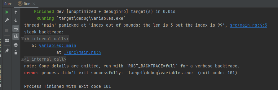 에러 메시지에는 패닉 메시지와 패닉이 발생한 소스 코드의 위치가 출력된다.