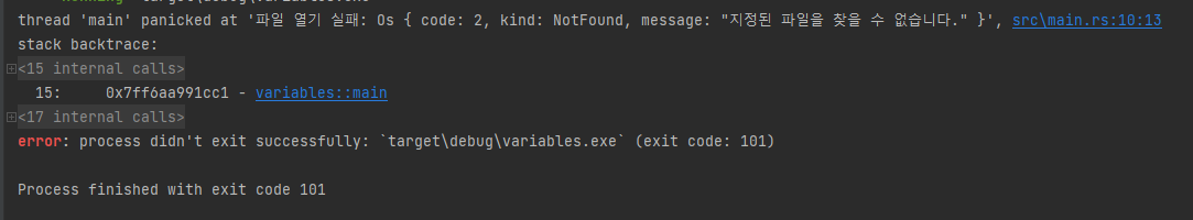 위 예제는 결과값이 Ok 이면 변수 f에 파일 핸들을 리턴해서 파일의 내용을 읽거나 쓸 수 있다. hello.txt 파일이 존재하지 않을 경우 panic! 매크로의 출력결과를 볼 수 있다.