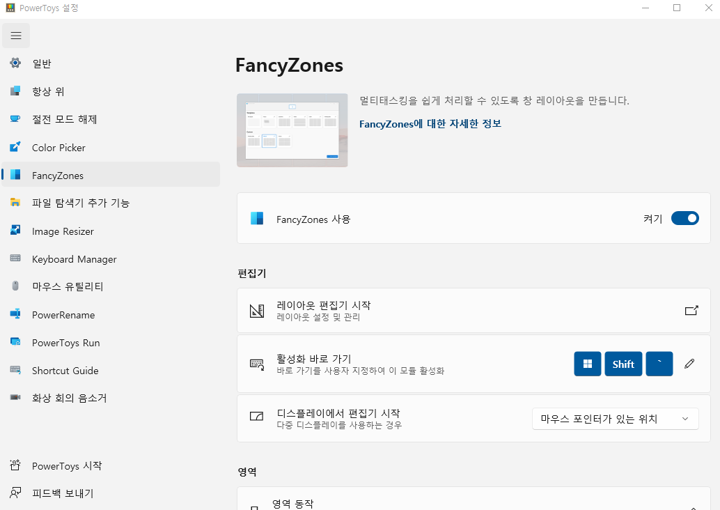 - 사용법: https://docs.microsoft.com/ko-kr/windows/powertoys/fancyzones