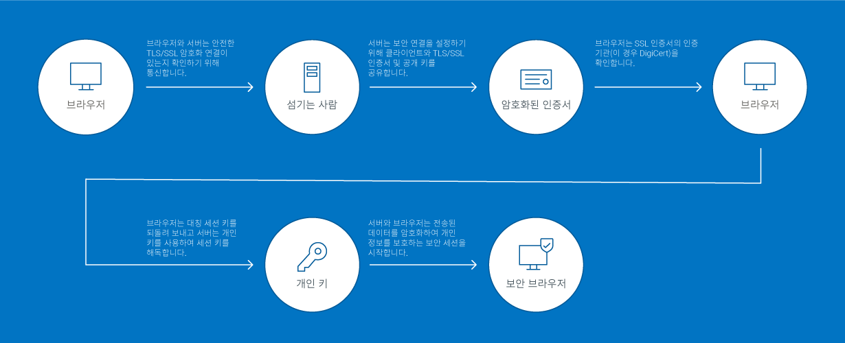 - 브라우저 SSL(https)로 보호된 웹 서버(웹 사이트)에 연결함. 브라우저에서 서버가 자신의 신원을 증명하도록 요청함.