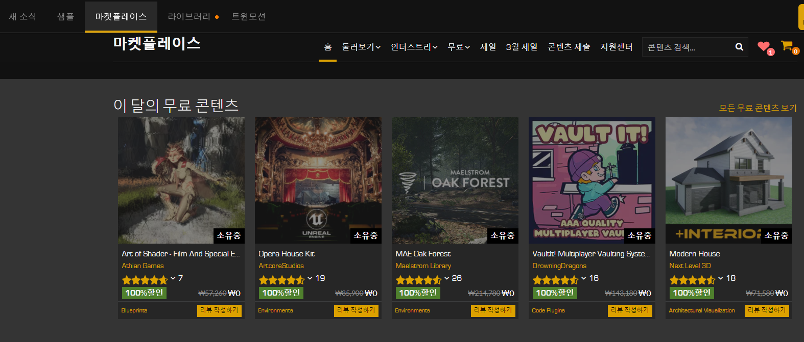 무료 에셋만 보자면 유니티의 에셋스토어가 좀더 다양하고 많지만 언리얼 엔진의 마켓플레이스는 퀄리티 좋은 유료에셋을 매달 5개씩 100% 할인으로 판매(?)하고 있다.